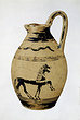 | Description: | Much missing, including nearly all of the trefoil mouth; restored in plaster. Ring foot and double rolled handle. The neck seems to have been glazed; on the shoulder below it a wavy line. On the body, two panels of very complicated dotted maeander, two elaborate floral designs and a pair of winged(?) horses marching abreast to the right; their heads are missing. Buff clay; black glaze much peeled. | |