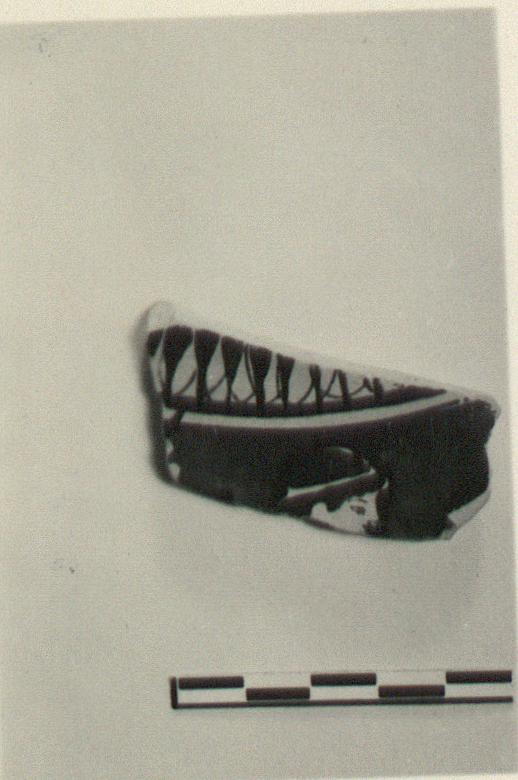 | Description: | Fragment from upper wall. Head of a youth(?) to right, with the top of an object in the field in front of him. Fillet reserved. Above, a band of interlacing lotus buds. Glaze in field fired gray. No relief contour. | |