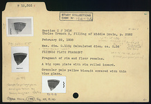 | Description: | Fragment of rim and floor remains. A big open plate with rim rolled inward. Granular pale yellow biscuit covered with thin blue glaze. | |