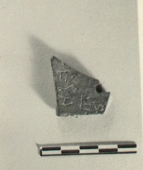 | Description: | Fragment from a small plain amphora(?). Incised on inside: <graphic> | |