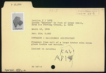 | Description: | Fragment from the wall of a large krater with brown glaze inside and out. Incised on outside: <graphic> | |