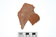 | Description: | Fragment from the wall of a large krater with brown glaze inside and out. Incised on outside: <graphic> | |