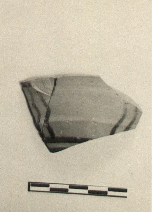| Description: | From a small open cup with outward-tilted side wall and plain lip; apparently with horizontal handle at the lip. On lower body, bands; above, vertical wavy lines. Glazed inside, with a reserved band on the lip and another halfway down the wall. | |