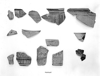 Description:   From the wall of a large open pot, glazed inside. The outside glazed with four bands in thinner glaze. Above, a set of concentric circles in added white.
