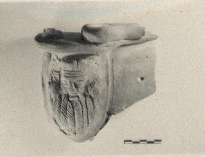 | Description: | Fragment from rim of a situla with handle attachment and applied mask of Dionysos below. Coarse reddish clay; the outside slipped. Joins P 9393. | |