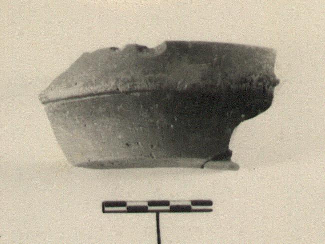 | Description: | Rather less than one-quarter preserved. Flat bottom, slightly concave, low wall; rim offset and in-sloping. At least two groups of concentric rings around center. Fine brown micaceous clay, flaky; good orange-red glaze. Samian A. | |