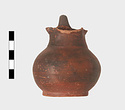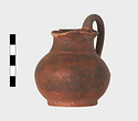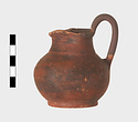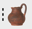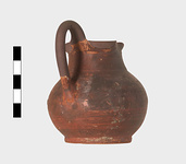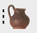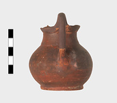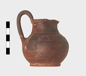 | Description: | Intact except for most of handle, chips from rim, and hole in bottom. A small trefoil-mouthed oinochoe on a raised flat base. Globular body; slight ridge between shoulder and wide neck. Thin vertical handle circular in section. Pinkish-buff clay, with a dark streaked reddish-brown glaze, on outside, except the base, and just within the mouth on the inside. | |