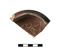 Glazed fired black to brown. Reserved: space inside foot, with glazed circle; resting surface; edge of flange; scraped groove at junction of flange and wall.