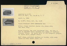 Description:   From a large shallow plate; rim piece with low base ring. Broad flaring rim with thickened lip. On rim, a row of punched holes between two bands of vertical incised lines; on outer half of lip diagonal gouges, on inner half, gouged ovals.