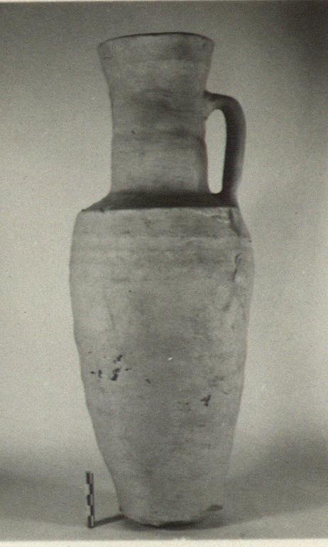 | Description: | Projecting base ring broken away; one handle and piece of lip missing. Slender body with broad wheel grooves; short angular shoulder, straight neck flaring slightly to lightly collared rim; handles well below lip to shoulder. Dipinto in red on shoulder: <graphic> Highly micaceous russet clay. Remains of light slip. Cf. P 12353. | |