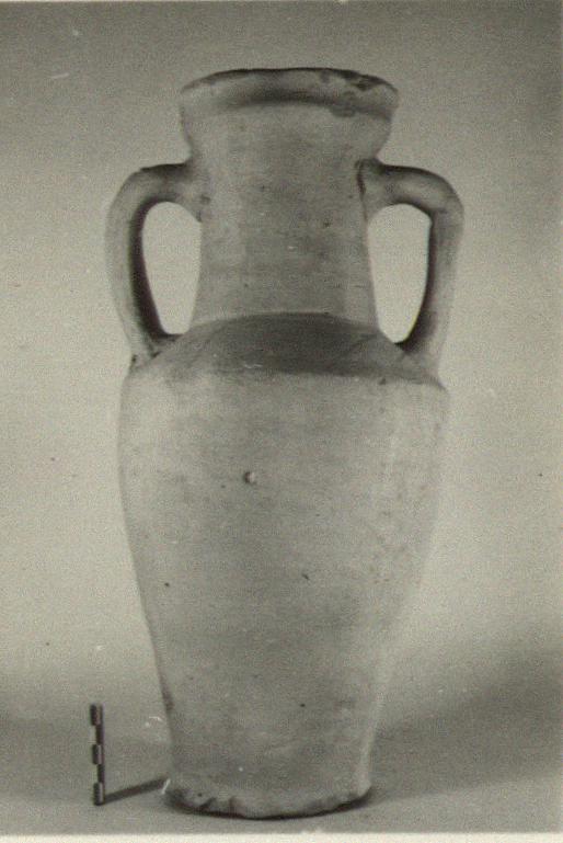 | Description: | Intact except for chips. The lip dented in, in making, and one handle somewhat battered. Similar to P 12352 (Ω 379) in shape but somewhat more squat and the collar at the rim more marked. Dipinto in red on shoulder: <graphic> Micaceous pinkish clay. Light slip. Cf. P 12357 (Ω 394). | |