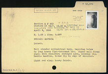 | Description: | Intact. Tall slender cylindrical body, tapering below to long heavy flat-bottomed toe. Upper wall forms angle with shoulder; straight neck, echinus lip; double handles, below lip to edge of shoulder. Light red clay; heavy fabric. Capacity: 31390 cc (VG, 14 August 1956). | |