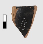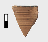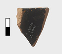 | Description: | Fragment from upper wall and rim. Around the top of the wall a collar with seven grooves. Traces of the attachment of a cross-arm. Black glazed on inside and on top of rim. | |