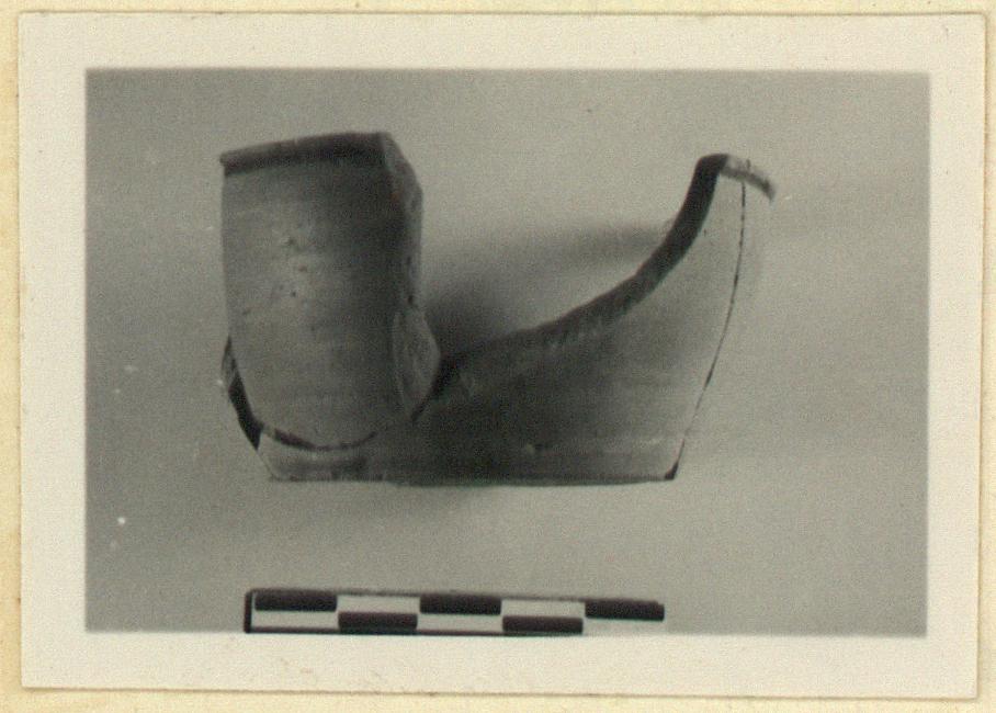 | Description: | Fragments missing from the wall. Flat base, steep side wall; flat rim with slight out-turned projection. Flaky black glaze on inside only. A brown line just below the lip outside. | |