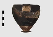 | Description: | One handle and fragments from wall and base are missing. Corinthian type; cross-hatching on lower wall; much contracted toward the base; lip incurved. Underside of foot reserved with two glazed circles; handle spaces reserved. Glaze mottled in part to red and whitish. Cf. Agora XII, no. 325. | |