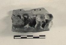 | Description: | Fragment of keel and part of upper wall. Above two rows of attached miniature mushrooms is preserved part of a row of small pierced holes and a trace of cut-out work. Gritty reddish clay, brownish slip. | |