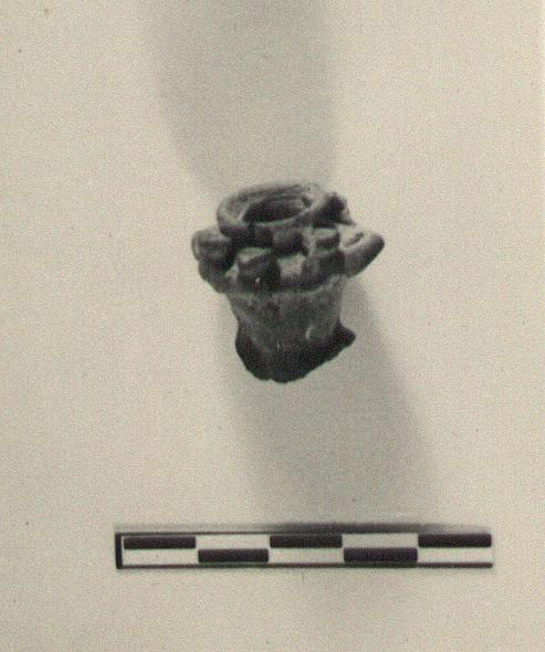 | Description: | From handle of a large kernos. A tiny kernos with pierced handles and six still smaller cups attached to the keel. Gritty dark clay, dark wash. | |