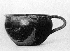 Description:   Fragments of rim, body and bottom missing; restored in plaster. A deep open cup with small sharply out-turned lip and flat reserved bottom. Handle reserved, and decorated on the outside with groups of lines, horizontal or vertical.