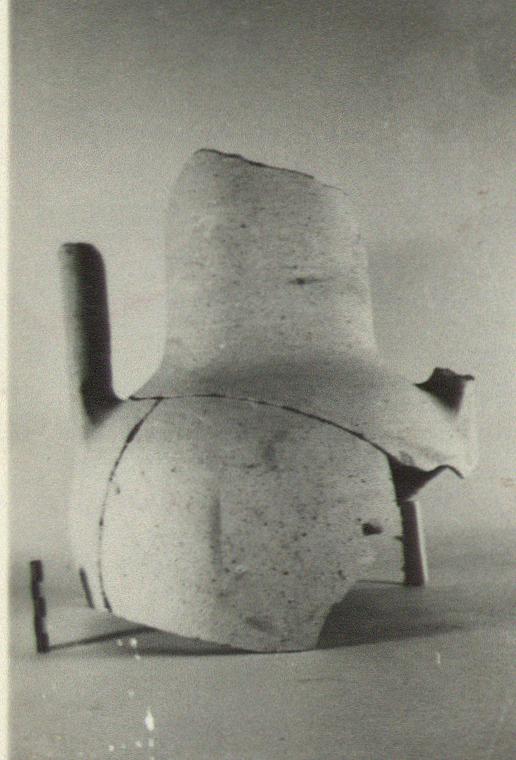 | Description: | Shoulder, lower part of neck and lower parts of handles preserved; non-joining pieces in tin. Cylindrical neck, rounded shoulder, broad handles, triple grooved. Dipinto in red on shoulder: <graphic> Very gritty orange-buff clay. Light gray slip. ADDENDA Lower half added; cone-shaped body, small flat bottom. | |