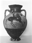| Description: | Mended from many pieces; fragments missing from walls. Decoration in panels. Horse and rider right on each side. Scanty incision for interior details; red for the horses' manes, and a line around the inner edge of the lip. Smooth polished finish on the panel, resembling a dilute glaze wash. The foot unglazed beneath, the pointed end of the body of the pot appearing within the base ring. The neck glazed for 0.05m. inside. Much warped and damaged in making: the neck not round; higher on one side than on the other. In one side a large dent. Thin, rather dull black glaze; well preserved on one side, on the other, much peeled. | |