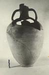 | Description: | Pieces of shoulder and lip missing. Restored in plaster. Very low base ring, depression in center of bottom; rounded shoulder; narrow, short neck with groove and ridge at bottom of vertical lip; ridged handles, below lip to shoulder. Reddish-buff clay, burned gray to black and warped in upper part. | |
