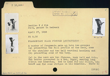 Group a): preserves the full profile of the neck, some of the shoulder and two tall vertical handles. On the neck are two figures, very tall and thin. The better preserved is a man, right, wearing long chiton and himation. Red is used for his fillet, his beard and for some stripes on his himation; white is used for his long staff, which he holds in front of him, and perhaps for stripes on the chiton. The figure on the other side, of which only the lower part is preserved, is practically a replica of the first so far as can be told. At top of shoulder, rough tongues, then the top of a head and part of some other figured decoration.