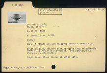 | Description: | Edge of flange and lip chipped; handles broken off. Profiled base; concave handle; upper body shallow and broad; lip slightly out-turned; two piercings in flange at each handle. Light brown clay. Traces of white slip. | |