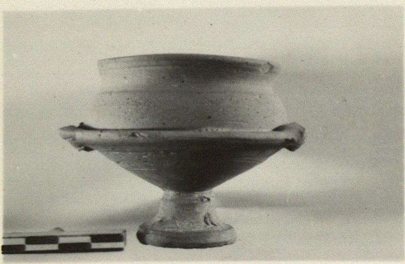 | Description: | Edge of flange and lip chipped; handles broken off. Profiled base; concave handle; upper body shallow and broad; lip slightly out-turned; two piercings in flange at each handle. Light brown clay. Traces of white slip. | |