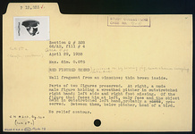 | Description: | Wall fragment. Parts of two figures preserved. At right, a nude male figure holding a wreathed pitcher in outstretched right hand; left side and right foot missing. Of the figure that faces him at left, only face and the object held in outstretched left hand, probably a cake, preserved. Between them, below pitcher, head of a bird. No relief contour. Thin brown glaze inside. | |