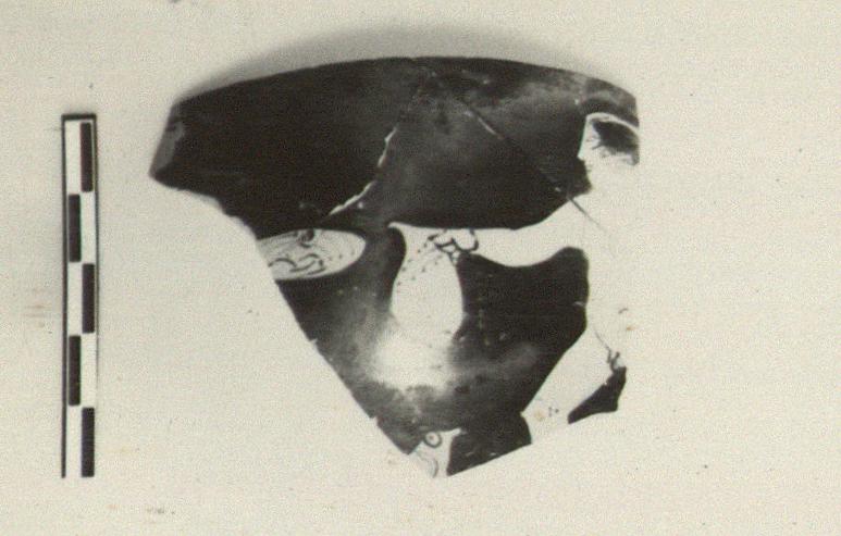 | Description: | Wall fragment. Parts of two figures preserved. At right, a nude male figure holding a wreathed pitcher in outstretched right hand; left side and right foot missing. Of the figure that faces him at left, only face and the object held in outstretched left hand, probably a cake, preserved. Between them, below pitcher, head of a bird. No relief contour. Thin brown glaze inside. | |