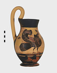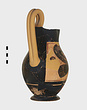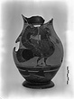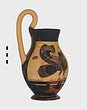 | Description: | The mouth and the handle missing, with fragments of the body. Flaring echinus foot. In a square panel on the body, bordered with purple, a siren, right; a rosette in field in front. Good incision; added purple for chest, face, wing and feathers. Two small reserved triangles on opposite side of body. Glaze black to red. | |