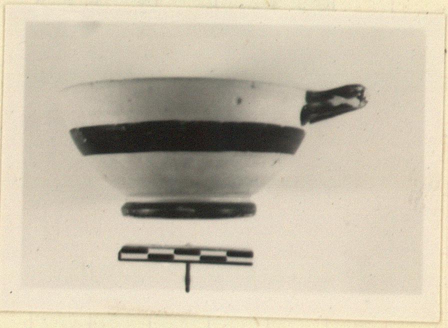 | Description: | Complete. Small deep cup on torus ring foot; lip flat on top, slightly out-turned. Small, slightly up-tilted handle set at lip. Glaze banded on outside and underside. Lip unglazed, inside glazed save for center of floor, reserved and ornamented with two glazed rings; outside of handle glazed. | |