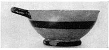 | Description: | Complete. Small deep cup on torus ring foot; lip flat on top, slightly out-turned. Small, slightly up-tilted handle set at lip. Glaze banded on outside and underside. Lip unglazed, inside glazed save for center of floor, reserved and ornamented with two glazed rings; outside of handle glazed. | |