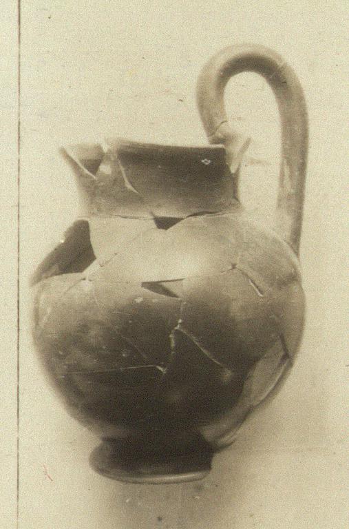 | Description: | Mended from many fragments; bits missing from lip and sides; restored in plaster. Spreading ring foot, unglazed beneath and on the edge. The neck slightly offset at the shoulder. Glossy black glaze all over outside and on neck inside. Much mottled with red on the left side and somewhat on the handle. | |