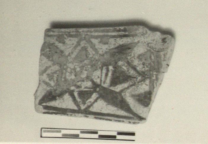 | Description: | From a large openwork stand; most of the one panel preserved, broken above and below. The panel framed by two glaze bands; within, an elaborate eight-pointed rosette star. Rather coarse pink clay; buff surface. Dull glaze, fired red to black. | |