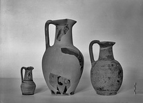 Description:   Complete except for part of lip, restored in plaster. Flat base; slender eggy body; tall neck narrowing slightly below trefoil lip.
