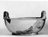 | Description: | Two non-joining fragments preserve both handles, most of the base and part of the rim and walls. Restored in plaster. Ring foot; open body; narrow projecting rim flat on top. Two heavy horizontal handles, round in section, rising from rim. Worn black glaze over all, except underneath. | |