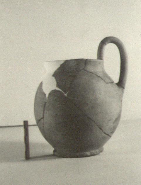 | Description: | The front of the lip, part of the base, and a little of the wall restored in plaster. Round-bodied jug on projecting ring foot; no neck, wide low trefoil lip only slightly out-turned. Grooved double handle lip to shoulder. Coarse hard brown clay, with smooth surface. | |