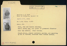 | Description: | Neck, rim and handle missing. Restored in plaster. Small plump jug, its point of greatest diameter near the middle. Flat bottom. Black glaze, almost entirely peeled, not reaching quite to bottom; reserved band around middle. | |