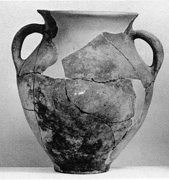 Description:   Parts of wall, lip and base restored in plaster. Large amphora on small ring foot; broad ovoid body; wide neck; plain slightly flaring lip flat on top. Handles, round in section, neck to shoulder.