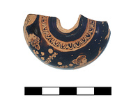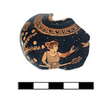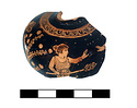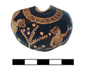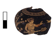 | Description: | Shoulder piece of squat lekythos. A narrow band of black egg and dart at top of shoulder. Below, scene with playing women: parts of three figures and tree preserved. At left of tree, a woman facing left with large object in outstretched hands; figure preserved from waist up. To right of tree, woman facing right with left arm raised and thyrsos held out at waist level in right hand; preserved from slightly below waist. Further right, outstretched hand of third figure. Both of preserved figures wear thin chitons, bracelets and fillets. Added white(?) for the fillets, the hair brown. Relief contour for profiles and napes. | |