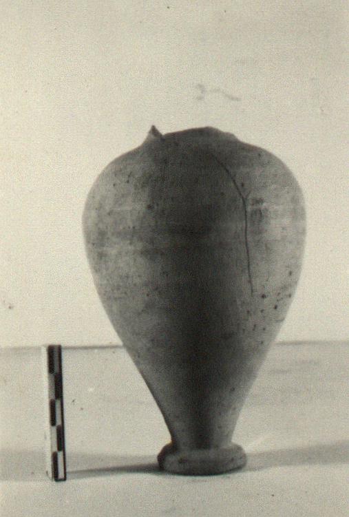 | Description: | Neck of large unguentarium missing. Plump body tapering to flat disk foot. Red line above shoulder. Brown clay. Light gray-brown slip. | |