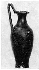 | Description: | Small fragments missing. Tall slender body; round mouth; flat high-arching handle; the wall flares slightly at the bottom to meet the flat resting surface. Black glaze all over exterior, inside mouth and neck and in streaks on interior. | |