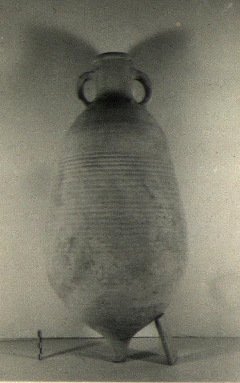 | Description: | Toe slightly broken, otherwise intact. Small handles, body lightly ribbed, swells toward bottom and ends in pointed toe. On shoulder a red dipinto: <graphic> Buff clay and slip. | |