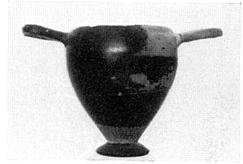 On lower part of body good black glaze; on upper part, dull and flaky. Remains of red rubbed on reserved parts. Two concentric circles on underside, within foot.