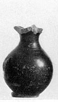 Description:   Handle and much of trefoil mouth missing; hole in bottom; much of foot chipped away. Base nearly flat; plump body; tall neck.