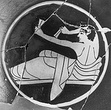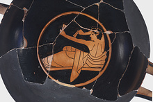 Description:   Mended from many fragments; restored in plaster. Medallion, base and handles complete; more than half the rim missing. Medallion scene depicts youth reclining, playing castanets. Relief contours, save for the upper right arm and the reserved hair line and the tip of the nose. Eye drawn full face, slightly open at both corners. Iris approaching inner angle. The boy's back is seen from behind, but his legs and head in profile, left. His right arm is raised behind his head. The hair round his face in irregular scallops. No interior drawing.