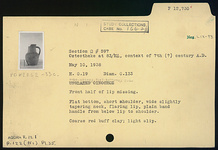| Description: | Front part of lip missing. Flat bottom; short shoulder; wide slightly tapering neck, flaring lip; plain band handle from below lip to shoulder. Coarse red-buff clay. Light slip. High-necked, flat-bottomed jug. | |