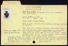 | Description: | Much of wall and all three handles missing; restored in plaster. Flat disk foot; rounded shoulder, its curve continuous with the neck. Broad projecting lip, the outer face slightly rounded. Glaze black except for underside and lower edge of foot and panel. Panel bordered above by row of blobs between bands; at sides by double row of dots between bands. A maenad pursued by a satyr; both figures right; she wears a chiton with deep kolpos forming sleeves; she looks back left and her left hand is raised. White for her flesh and for dots on her garment; trace of red on satyr's beard. A little coarse incision. | |