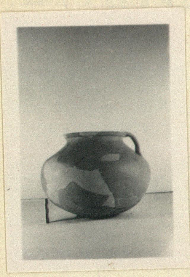 | Description: | Much of body and fragments of lip missing; restored in plaster. Plump round-bottomed cooking pot with sloping, slightly concave shoulder. Round mouth, flaring profiled lip. Band handle, lip to shoulder. Handmade of brown micaceous clay; slipped. Rim and shoulder wheelmade. | |
